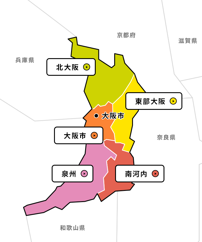 大阪府は、大きく5つのエリアに分かれる。伊丹空港をはじめファミリー向けの遊園地などがある「大阪北部エリア」、寺社仏閣や古室山古墳、温泉など見どころ満載の「東部大阪エリア」、梅田駅を筆頭に大阪府屈指の繁華街で形成される「大阪市エリア」、非常に歴史の古い史跡や神社仏閣があり大阪で唯一の村がある「南河内エリア」、そして関西国際空港があり世界遺産に登録された仁徳天皇陵古墳や史跡などがある「泉州エリア」だ。